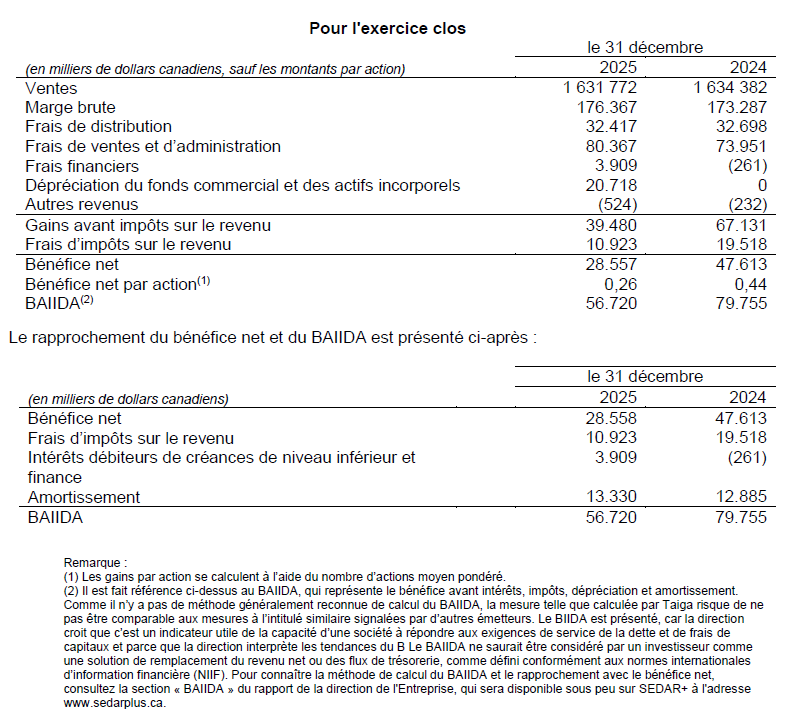 BURNABY, C.-B., le 27 février 2026 – Taiga Building Products Ltd. (« Taiga » ou l’ « Entreprise ») a publié aujourd’hui ses résultats financiers pour l’exercice clos le 31 décembre 2025.