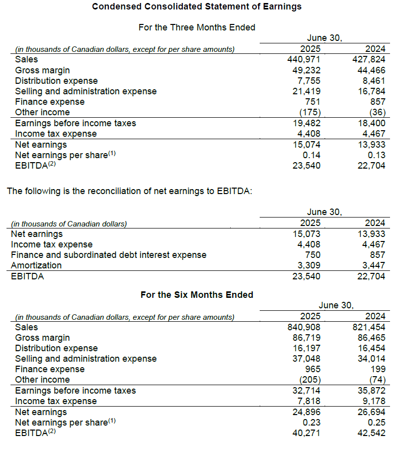 Net earnings for the quarter ended June 30, 2025 increased to $15.1 million from $13.9 million over the same period last year primarily due to increased gross margin dollars.