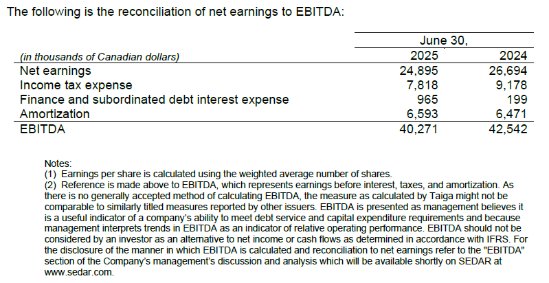BURNABY, BC, August 8, 2025 – Taiga Building Products Ltd. (“Taiga” or the “Company”) today reported its financial results for the three and six months ended June 30, 2025 and 2024.