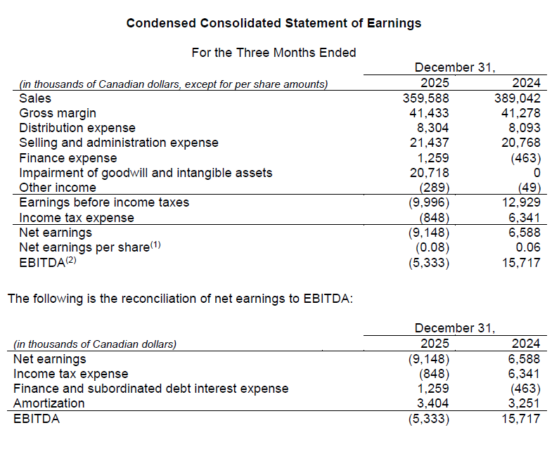 Net earnings for the quarter ended December 31, 2025 decreased to a loss of $9.1 million, compared to net income of $6.6 million in the same period last year, primarily due to a $20.5 million non-cash write-off of goodwill and intangible assets related to Taiga’s subsidiary in Washington State. The impairment is related to a decline in housing market activity in the US. While the write‑down reflects current market conditions, management continues to believe in the long‑term fundamentals of the operation and expects its underlying value and performance to improve as U.S. housing and renovation markets recover.