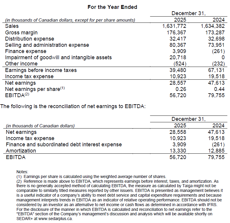 BURNABY, BC, February 27, 2026 – Taiga Building Products Ltd. (“Taiga” or the “Company”) today reported its financial results for the year ended December 31, 2025.